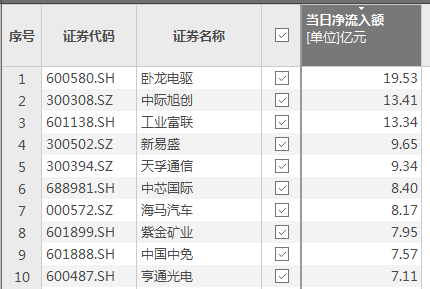 上证报中国证券网讯(记者李雨琪)Choice数据显示,12月22日,资金净流入额前十的个股为卧龙电驱、中际旭创、工业富联、新易盛、天孚通信、中芯国际、海马汽车、紫金矿业、中国中免、亨通光电。其中,中际旭创、新易盛、天孚通信、亨通光电等均属于CPO概念股。