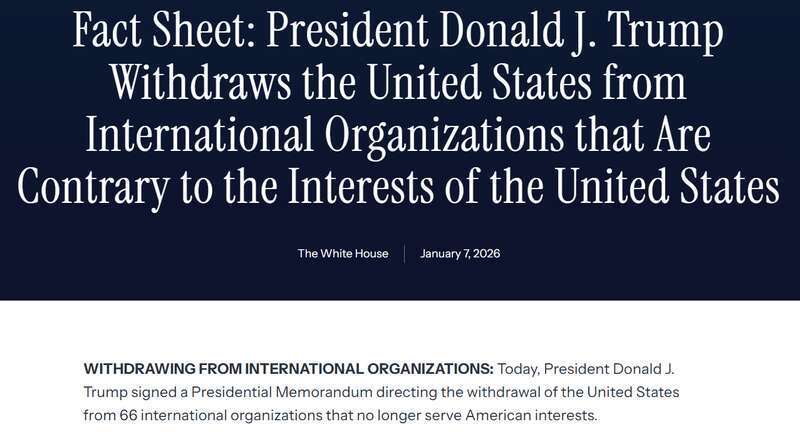 中国青年报客户端北京1月8日电(中青报·中青网记者 王梓)当地时间1月7日,美国总统特朗普签署了一项总统备忘录,指示美国退出66个“不服务于美国利益”的国际组织。